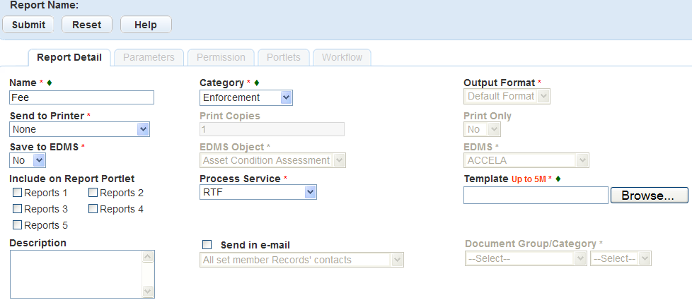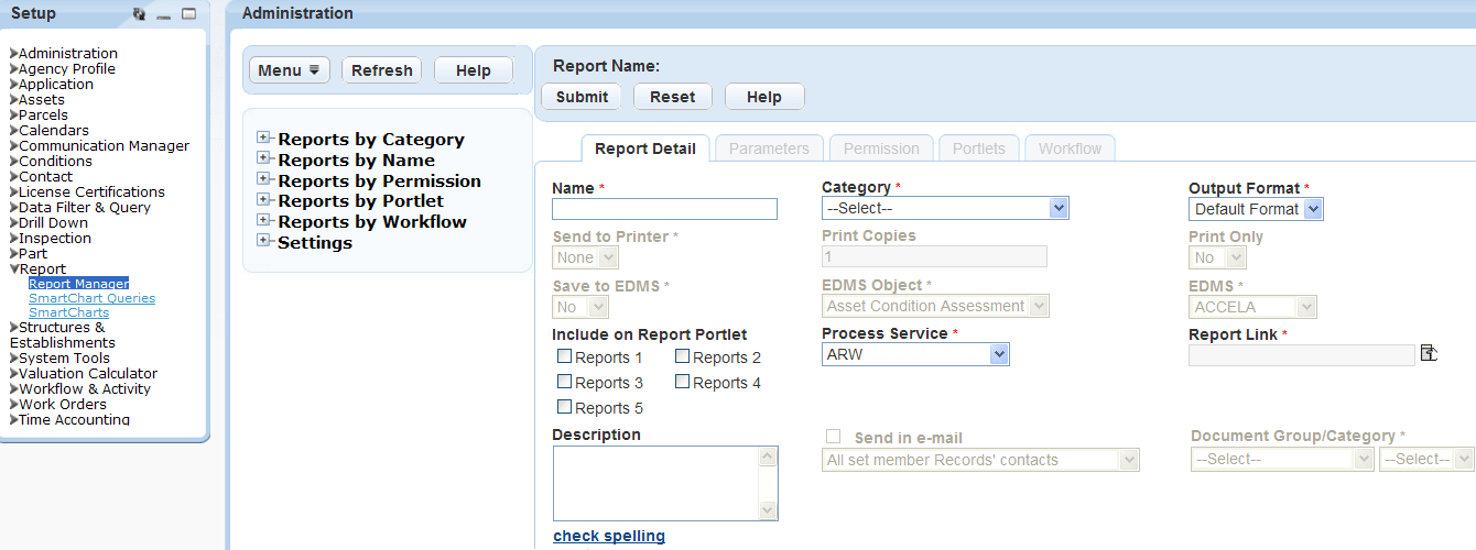 Name Enter the name of the report. Category Select the category the report should display under. Report Service Select the client-side executable report service. For example, select MS Excel EXE or MS Word EXE. - Click Submit..