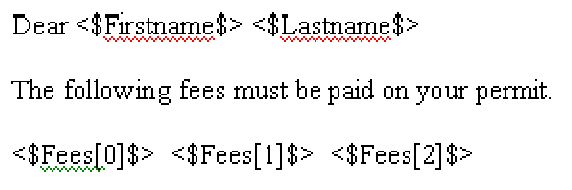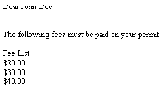 In Figure 5, Civic Platform replaces <$Fees[0]$>, <$Fees[1]$>, and <$Fees[2]$> with a list of fee values from executing the following SQL statement: