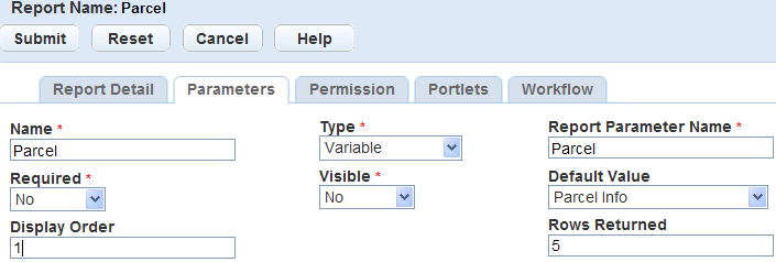 Name Enter the name of the report. The name you enter displays in the Report Portlet or portlet-specific report menu. If this is a Permit Print report, enter Permit Print. Category Select the category the report belongs to. Report Service Use the drop-down to select the URL_Report report service. Report Link Enter the URL to the report source. For example, enter http://permit.accela.com. To pass static parameters, include them in the URL address. For example, enter http://permit.accela.com/PERMITID07BBP-00000-0010. To pass Accela-provided parameters, you must add parameters in the Parameters portlet.