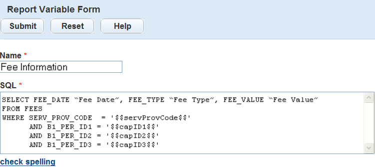 Civic Platform replaces the heading for the variable <$Fees$> with the name of the column alias “Fee List” from the SQL query. If you do not use an alias, the column name [FEE_VALUE] displays as the column label.