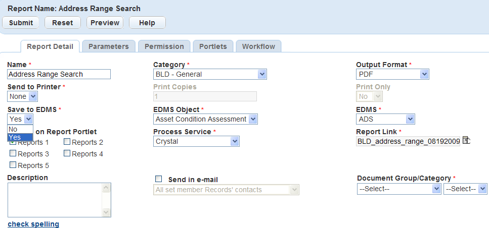The Event Management Scripting Engine (EMSE) has full control of launching reports set up in Report Manager. EMSE retrieves the Report Object through the report name and automatically provides parameter values. You can set up reports to save automatically to an Electronic Document Management System (EDMS) in a variety of formats including Adobe Acrobat (.pdf), Microsoft Excel (.xls), and Rich Text Format (.rtf). You can set up an event script to send and save reports to multiple destinations, and then run the reports multiple times. Contact your Accela Services Implementation representative for information on writing and running this kind of event script. For general information on using scripts in Civic Platform, see the Accela Civic Platform Scripting Guide.