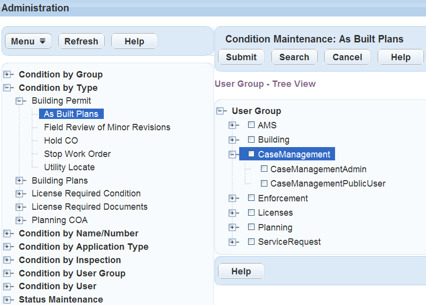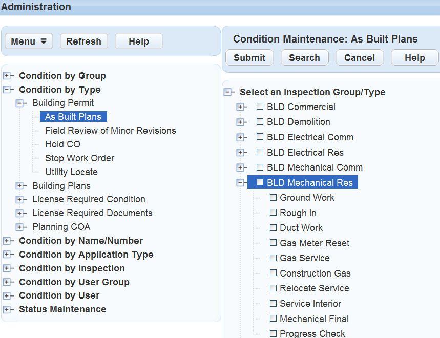 Use the main Administration navigation tree to locate the condition you need. You can locate a condition by Group, Condition Type, Name/Number, Application Type, Inspection, User Group, or User. If you cannot locate the condition name you want to apply, you can search for it. Refer to Assigning Conditions.