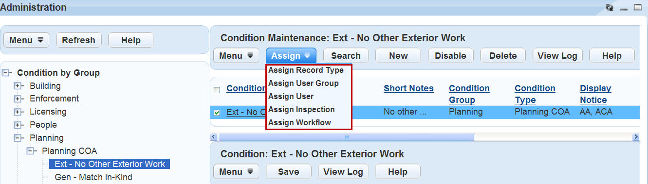 To assign conditions to a record type, user group, inspection group, or workflow