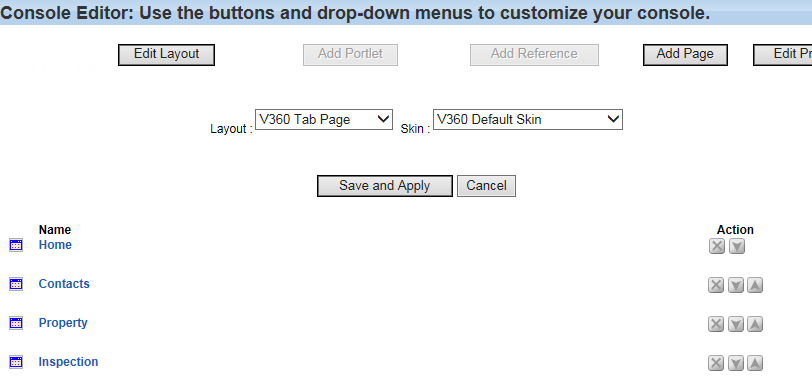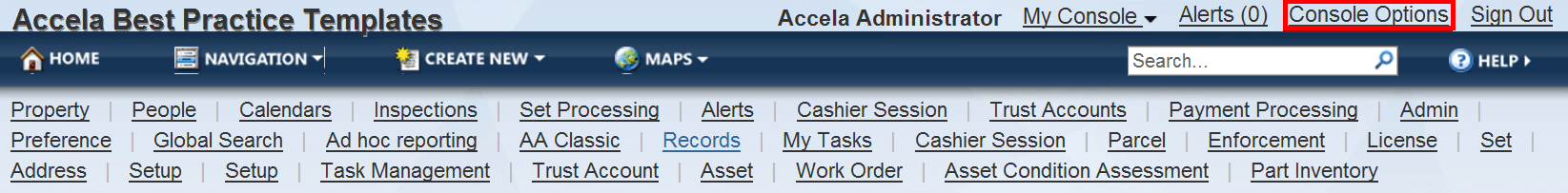 Use the Console Editor to specify the names of the main links that display on your console, the order in which they display, and how many main links you want to display. Main links might include Civic Platform Administration, V360 Admin, Building, Inspection, Home, and Report Manager, for example. Then, for each main link, you define which portlets open on your console and where. For example, inspectors might want to associate the Calendar and Inspection portlets in the large portlet area, and the Bulletin Board portlet in the smaller side portlet area for the Inspections main link. Some portlets allow for further customization. For more information on customizing portlets, see Customizing Menus, Tabs, and Drop-down Lists.