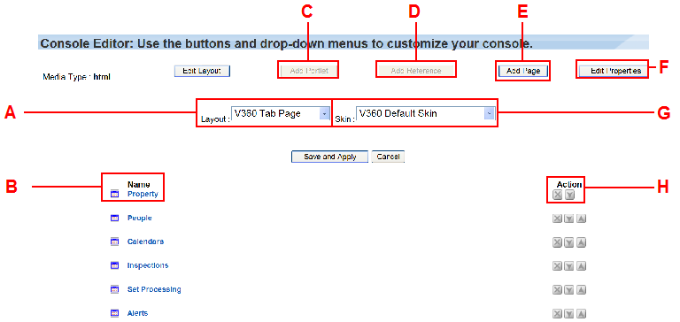 | C | Add Portlet button. This button activates when you select a main link. Click this button to associate a portlet with a main link. |