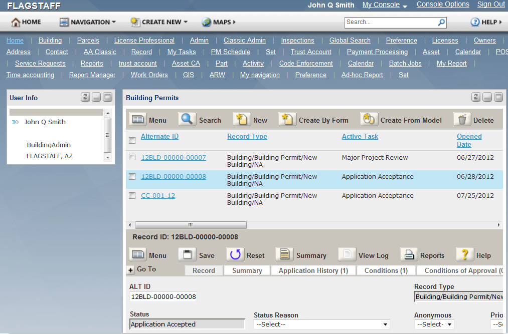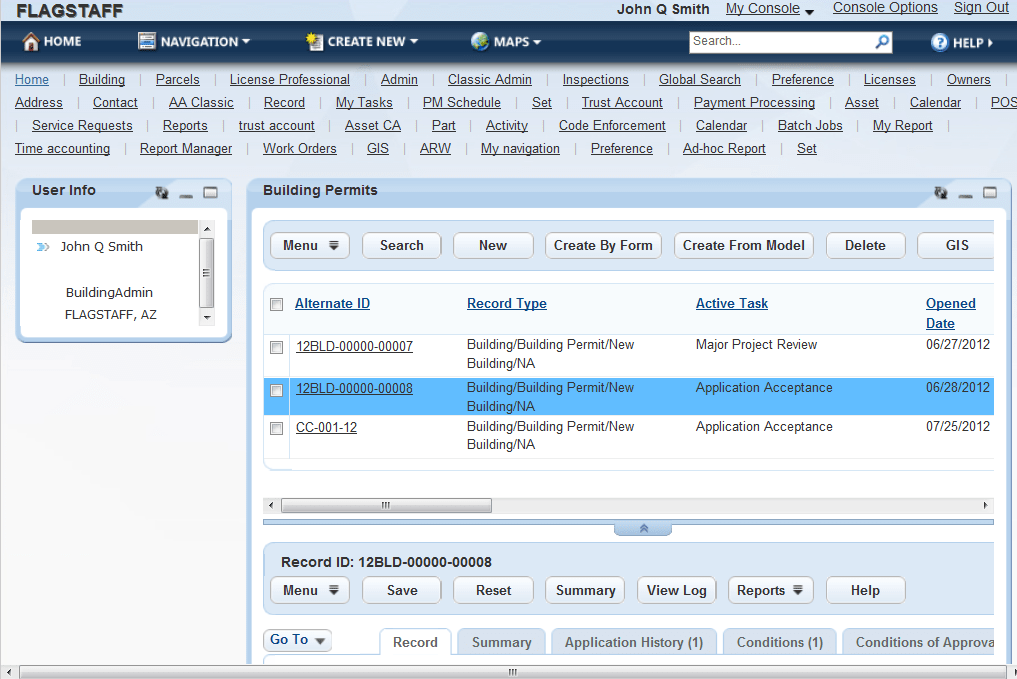 Civic Platform provides both a standard skin and a simple skin, which is the default. Compared with the standard skin, the simple skin presents streamlined look for pages and buttons, and better organizes information in the console. The simple skin enables users to expand and collapse the record list portlet to maximize the size of their workspace.