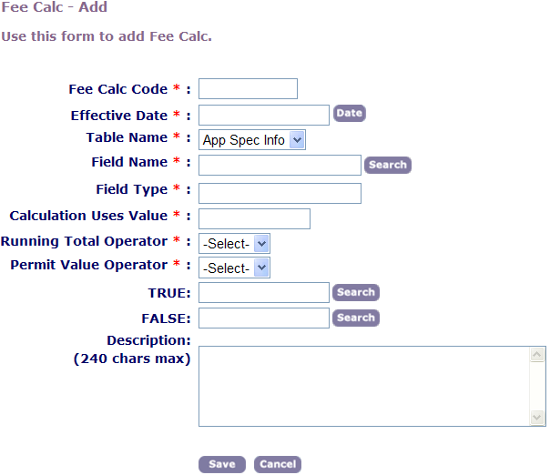 There are two operators for each fee calculation. The first operator, Running Total Operator, determines how the calculation deals with the running total. The second operator, Permit Value operator, determines how the fee calculation deals with the field referenced by the fee calculation.