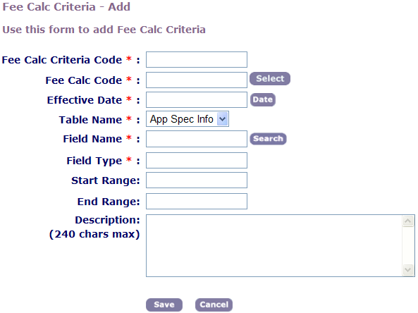 Table 3. Fee Calc Criteria Fields Description Enter the description for the fee calc criteria calculation. Effective Date Enter the date the Fee Calculation becomes effective. End Range Enter the ending amount for the fee calc criteria. Fee Calc Code Enter the code for the Fee Calculation used for this Fee Calc Criteria. Fee Calc Criteria Code Enter the Fee Calculation Criteria’s unique identification code. Field Name Use the drop-down menu to select the appropriate field name. Civic Platform populates these fields based on the Fee Calculation IDs. Field Type Enter the field type for the calculation. Start Range Enter the starting amount for the fee calc criteria. Table Name Use the drop-down menu to select the appropriate table name.