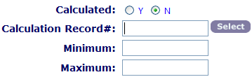 Calculated If you want to use the calculation records to determine a fee value, select Y, otherwise, choose N. Calculation Record # Select the calculation record you want to use to evaluate a fee value. You can call other calculation records from the initial calculation record. Minimum Enter the minimum value of the calculated fee value. Maximum Enter the maximum value of the calculated fee value.