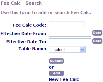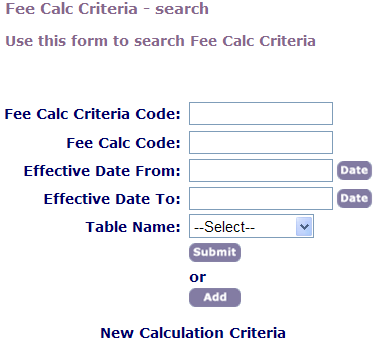 Search for an existing Fee Calc Criteria code by clicking the Submit button.