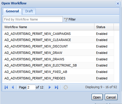 Workflow Designer displays the Open Workflow dialog with all the existing workflows in the General tab and all the draft workflows in the Draft tab. The existing workflows contain all the workflows configured in either Workflow Designer or the Classic Workflow tool.