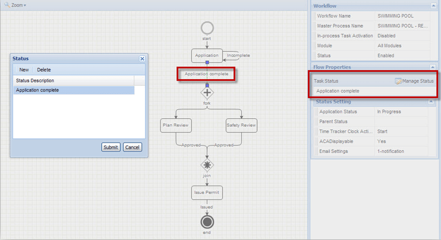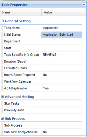 Proximity Alert If you click the field entry area, a “Proximity Alerts” window pops up. You can select the GIS proximity alerts to apply during the execution of the task. Sub Process Select an existing sub process that you want to add to the current task. You can also click the icon next to the field to create a new sub process in the current task. Sub Process Completion Required If you want the sub process in the current task to complete before moving to the next task, select Yes; otherwise, select No. Table 5. Flow Properties Property Description Task Status This field displays the status that a task must reach before the activation of its next task. If there are multiple statuses, a task only need to reach one of the statuses before the activation of its next task. Application Status Enter a status in this field. If the task that the flow widget starts from reaches the Task Status, the Application Status you enter in this field displays as the Application Status. Parent Status This field works with the flow widget that starts from a sub process task. Enter a status in this field. If the sub process task reaches the Task Status, the parent task that contain the sub process changes to the status in this field. Time Tracker Clock Action Select the time tracker clock action that triggers when the task reaches the selected status. The time tracker clock controls how the Time Tracker records In Possession time for workflow tasks and for applications. Citizen Access Displayable If you want Citizen Access to display the task, select Yes; otherwise, select No. Email Settings This field displays the number of notifications to send when the task reaches the selected status. “0-notification” means there is no notification, “1-notification” means Civic Platform sends one notification, and so forth. If you click the field entry area, an “Email Settings” window pops up. You can create, edit or remove the notifications.