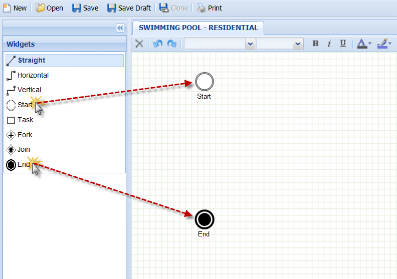From the Widgets panel, drag and drop a Start node and an End node onto your blank workspace. Simply click the node (Start, for example) then drag and drop it onto the workspace, leaving space between the nodes so you can enter details later, as show below. For descriptions of the widgets, see The Widgets Panel.