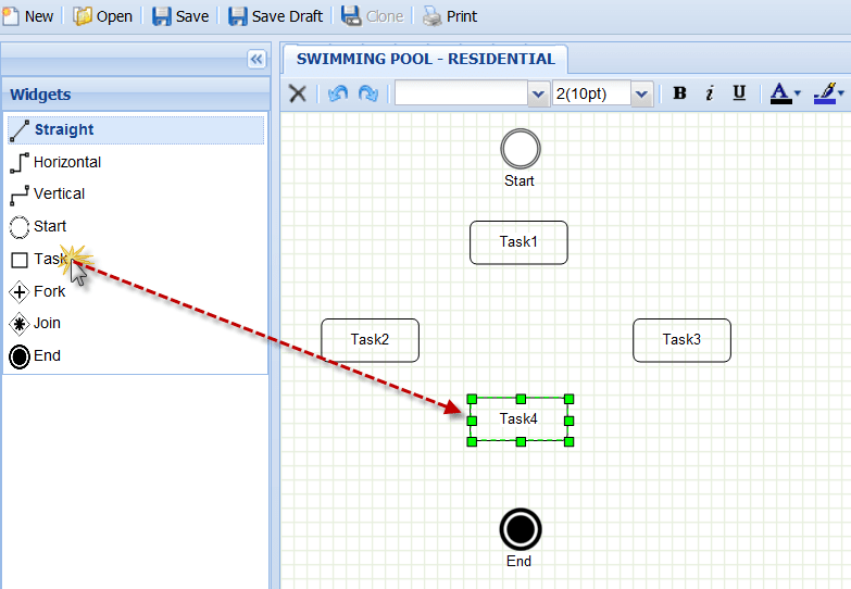 To connect two tasks, add a flow widget (Straight, Horizontal, or Vertical) as follows: