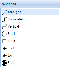 In the widgets panel, the straight, horizontal, and vertical widgets are flow widgets, and the start, task, fork, join and end widgets are node widgets.