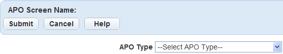 Select the APO Type associated with the fields you want applied to the new APO Screen Name. The APO Screen Name might be a name to easily identify the fields or their unique functions for the APO Type.