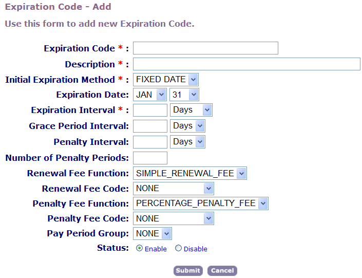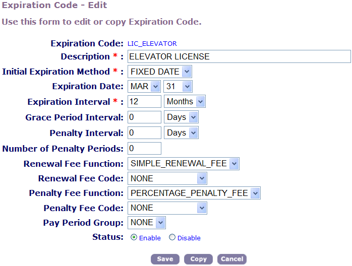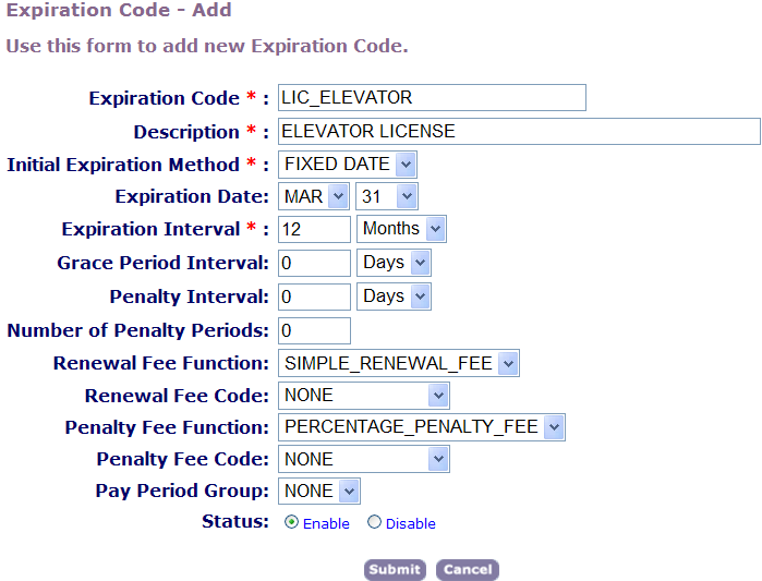 Table 1. Expiration Code Fields Expiration Code Enter a short, descriptive name to identify this renewal process so users can easily locate the appropriate expiration code. Description Enter a description to identify what the renewal process does. For example, enter “Applies to quarterly renewal fee.” Initial Expiration Method Select the method you want to use to calculate expiration dates. To enable a fixed expiration date, choose “Fixed Date.” To generate an expiration date based on the application's initial filing date, choose “Filed Date.” Expiration Date If you chose Fixed Date in the Initial Expiration Method field, use this drop-down list to choose the month and date when the license expires. Every license with this expiration code expires on this day. Expiration Interval Enter the number of days or months that a license remains active before expiring, then specify the date unit (days or months) from the drop-down list. For example, to enable an expiration interval of 2 months, enter “2” in the first field and choose “Months” from the drop-down list. Grace Period Interval Enter the number of days or months between the time that the license expires and the first penalty period, then specify the date unit (days or months) from the drop-down list. For example, to enable a grace period of 10 days, enter “10” in the first field and choose “Days” from the drop-down list. Penalty Interval Enter the number of days or months that each penalty period lasts, then specify the date unit (days or months) from the drop-down list. After the penalty interval, a subsequent penalty period can begin depending on the number of penalty periods you specify in the Number of Penalty Periods field. Number of Penalty Periods Enter the number of penalty periods that can pass before a license becomes inactive. For each penalty period, you might need to assess an additional penalty fee. Renewal Fee Function Select the function you want to use to generate the renewal fee. Run this function within the License batch process. Choose “None” if there is no renewal fee. Renewal Fee Code Select the code for the fee item you want to use to calculate the renewal fee. Penalty Fee Function Select the function you want to use to generate the penalty fee. Run this function within the License batch process. Choose “None” if there is no penalty fee. Penalty Fee Code Select the code for the fee item you want to use to calculate the penalty fee. Pay Period Group Select the payment period group you want to use for this renewal process. For any license that follows this renewal process, Civic Platform assesses only fees that belong to a payment period within this group. For example, you can configure a “2013” payment period within the Retail License payment period. Status If you want to start using this renewal process, click “Enable”; otherwise, click “Disable.”