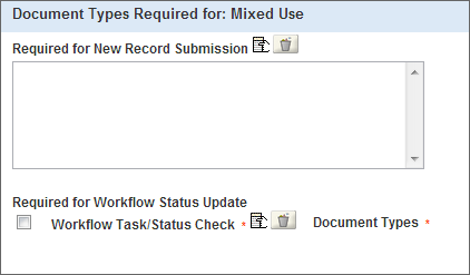 • Select the document type(s) that your agency wants to require as part of a new record submission. If needed, you can mark Select All to require all the listed documents. The selected document types display in the Required for New Record Submission box.