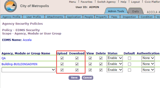 To enable users to upload and download documents, configure your agency Security Policy as shown below.