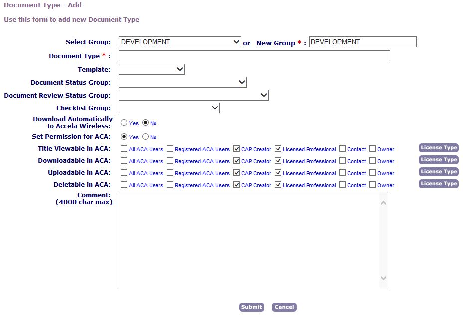 This section provides instructions on how to work with document types associated with a document group and, if your agency uses Citizen Access, define how to apply permissions to public users for the document type.