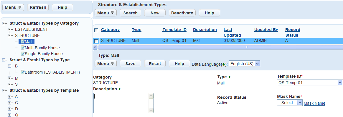 To include customized fields in a structure or establishment type, you can attach a template to the type. For information on templates, see Working with Templates.