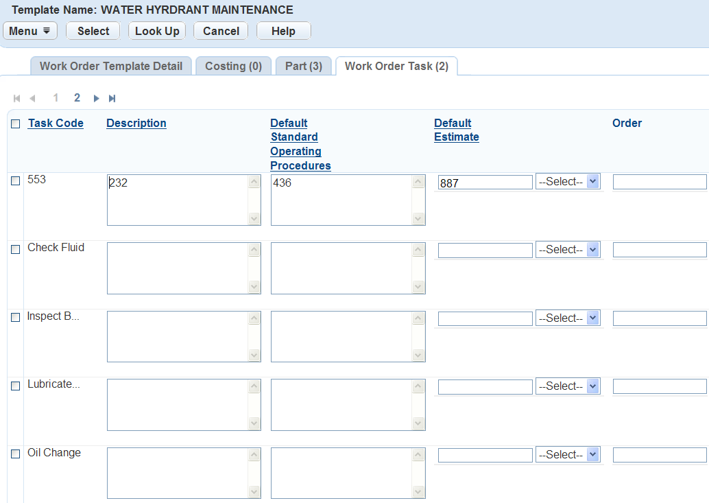 Use the following procedure to edit a work order task. You might need to do this, for example, to make it more specific to the work order template. When editing work order template task information, some of the task definition fields, such as the task code, are read-only. If you want to change the read-only fields, you must create a new task definition.
