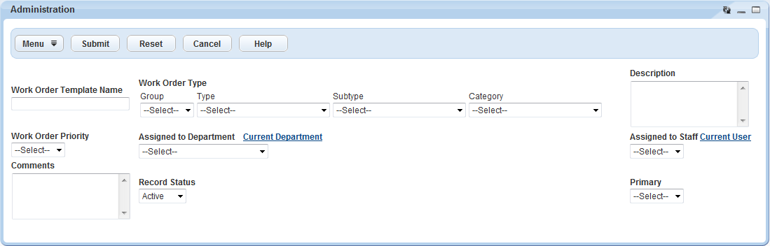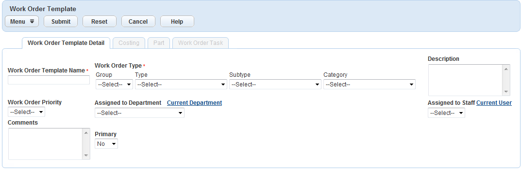 Table 1. Work Order Template Definitions Assigned to Department Select the department assigned to the work order. This field pre-populates the Assigned to Department field on the work order when creating a work order using the work order template. Assigned to Staff Select the staff member assigned to the work order. This field pre-populates the Assigned to Staff field on the work order when creating a work order using the work order template. Comments Enter any comments associated with the work order template. Description Enter the description associated with the work order template. Primary Use the drop-down list to set the work order template to be the primary one for the associated record type. When you create a work order, the basic work order information defined in the primary template automatically populates into the Assigned to Department, Assigned to Staff, Description, Work Order Type and Priority fields on the work order form. When the work order is submitted, the cost items, parts, and work order tasks within the primary template automatically associate with the work order, and they display under the corresponding tab. Record Status Record Status is a read-only field that indicates if a work order template is Active or Inactive. The record status is always Active, unless you delete the template. Work Order Priority Select the priority of the work order. This field pre-populates the Work Order Priority field on the work order when creating a work order using the work order template. Work Order Template Name Enter the name of the template created for the work order. Civic Platform uses this name to identify the template when creating a new work order. Work Order Type This field is a combination of four fields: Group, Type, Subtype, and Category. Each field is dependant upon the next. Select the work order type group. When you select the group, the type drop-down list displays. Select the type. When you select the type, the subtype drop-down list displays. Select the subtype. When you select the subtype, the category drop-down list displays. Select the category. Civic Platform uses these fields to pre-populate the work order group, type, subtype, and category when a user creates a work order using the work order template.