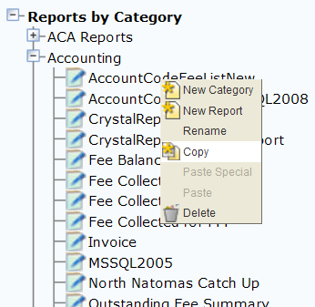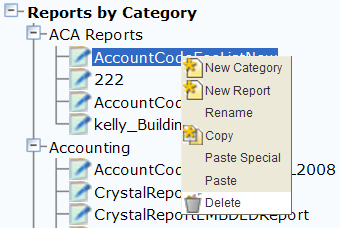 You can move or copy reports from one category to another in the Reports by Category navigation tree, with the copy/paste or drag-and-drop options. The copy/paste function provides a quick way to reference a report under more than one category. For example, the Census Bureau C-404 Statistical report gets ran by more than one department. You can copy/paste the report into each department category and change the report name as appropriate for that department. The report attributes copy over along with the report, so you do not need to re-do the setup steps for each copy of the report. However, if you make changes to a report that has multiple copies, you must either apply the changes to each copy of the report or delete the report and create new copies of the updated report.