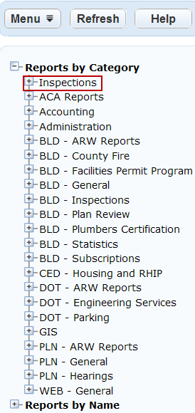 The categories that display for the user must contain at least one report to display in the Reports Portlet. The visibility of these categories also depends on the reports permissions. For example, if the Building category contains reports that are only accessible by the Building Inspector user group, the Building category displays only for that user group. This feature enables you to create custom categories for user groups and modules. For more information on assigning report permissions, see Assigning Permissions to Reports.