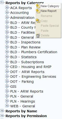 To add a new report to the category, right-click the new category and select New Report. For more information on adding a report, see Adding a Report.