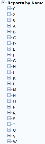 Civic Platform expands the Reports by Name category and displays a letter for the first letter of each report added to Report Manager.