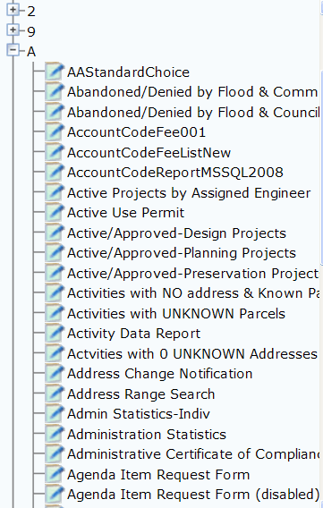 Civic Platform sorts reports added to reports administration by report name in the navigation tree. The first level of the navigation tree is from A-Z, and displays the reports according to their first letter. For example, the Permit Report displays under the letter “P.” This organization option is helpful when searching for a specific report.