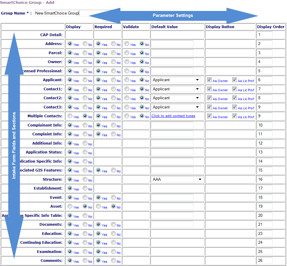 (APN) determines the parcel information. If you set the Display and Required parameters in this section to Yes, Civic Platform validates whether a user adds parcel information to the Parcels tab upon the submittal of a new record. |