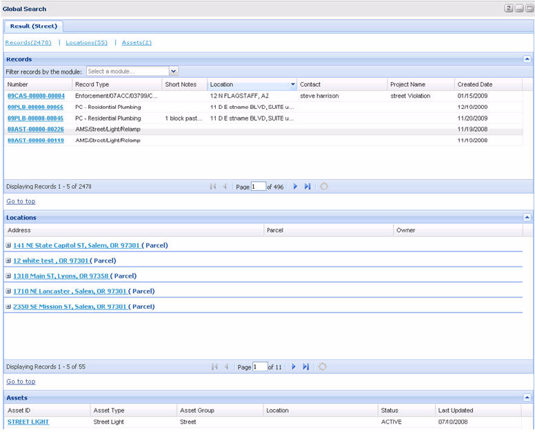 You can configure search to define how many max records return in a global search and how many result rows to display in a group results list page. For example, record result information is grouped together in pages and licensed professional result information is grouped together in pages. Within each group, a user can filter, page through, or sort through the result information.