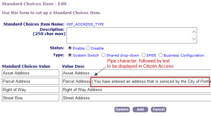 For Citizen Access, the REF_ADDRESS_TYPE standard choice can be used to add text that
