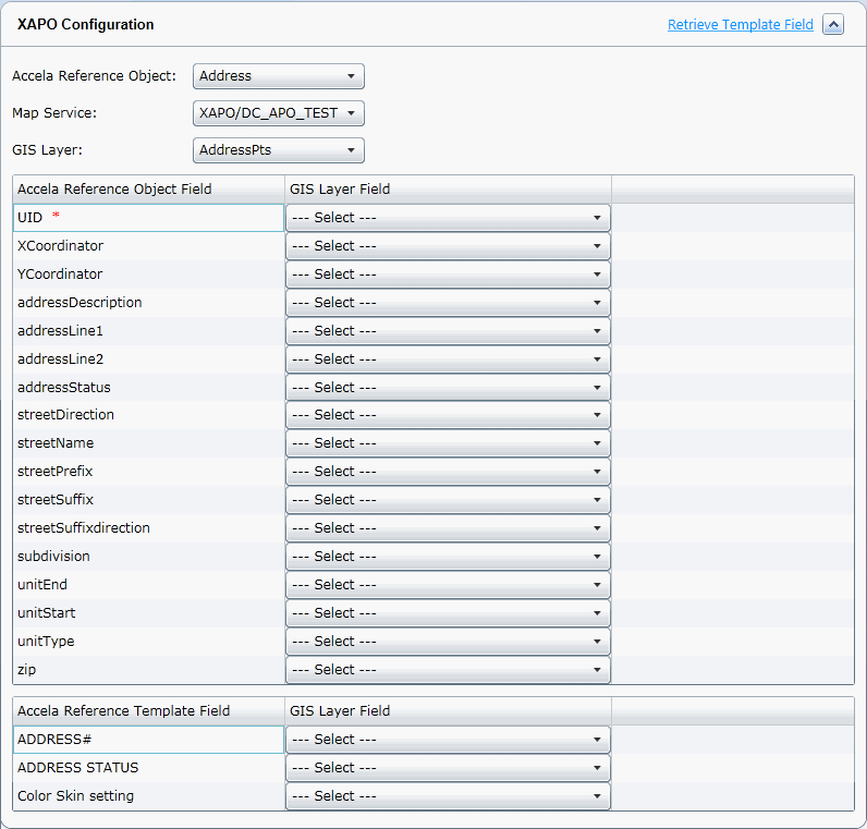 Note: Your agency administrator defines and enables address, parcel, and owner (APO) templates in Civic Platform. Active template attributes can display as Accela reference template fields in the Accela Silverlight GIS Administration site. When you map each APO template attribute to a GIS map layer field, users can retrieve the APO template data from the external APO data source.