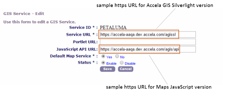 Civic Platform requires HTTPS connections with the Accela GIS (JavaScript) component. When configuring a GIS service in Civic Platform, the service URLs for the JavaScript version must specify https. If your agency uses Accela Silverlight GIS to support EMSE scripts, XAPO data sources, and proximity alerts with Civic Platform 8.x, the Service URL for Accela Silverlight GIS must also use https.