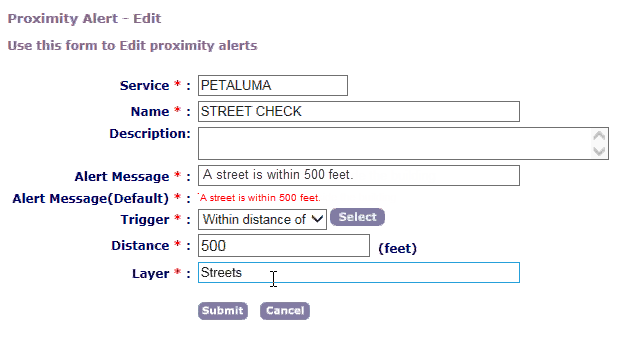 To configure a proximity alert on Civic Platform, go to Admin Tools > GIS > Proximity Alerts, and enter values in the following fields:
