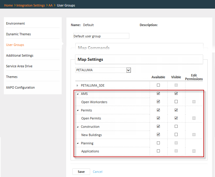 To make the dynamic theme visible by default to the user group, mark the Visible checkbox for that dynamic theme layer. If a dynamic theme is marked as visible, and the dynamic theme appears on the Layers widget by default. An end-user can choose to hide it.