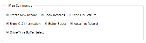 The Map Commands section allows the administrator to enable or disable map commands for the user group. The available map commands and the default configuration for each map command vary depending on the agency’s Civic Platform configuration.