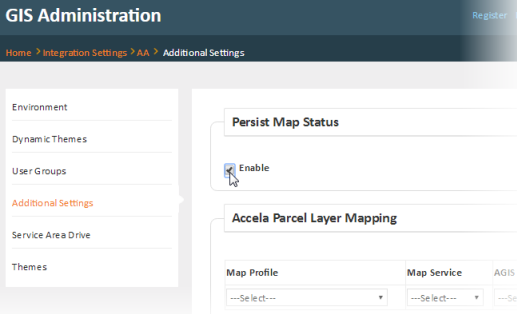 By default, a user's initial map view shows the map layers that have been assigned to the user group he belongs to. If your agency wants to allow the back-office staff to adjust and retain their own map view and settings, enable the Map Persist Status setting on the Integration > {product} > Additional Settings page on the Accela GIS Administration site.