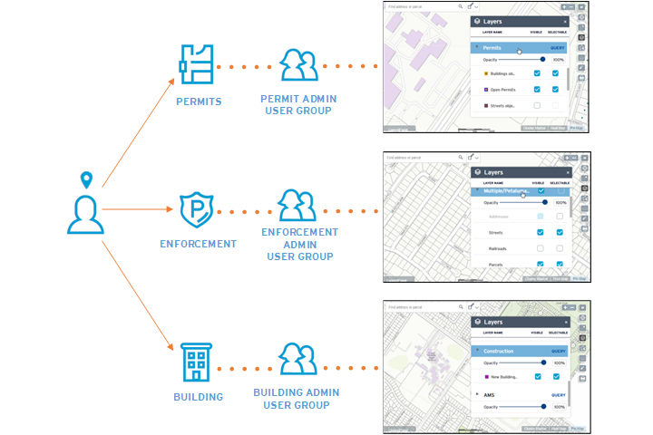 A user belonging to multiple Civic Platform user groups with access to different Civic Platform modules can see different map views based on the Accela GIS user group permissions. In Accela GIS Administration, a GIS user group is defined by leveraging Civic Platform user group memberships, and map layer permissions are assigned per GIS user group, with the ability to persist a user's map view and layer settings across multiple Civic Platform modules.