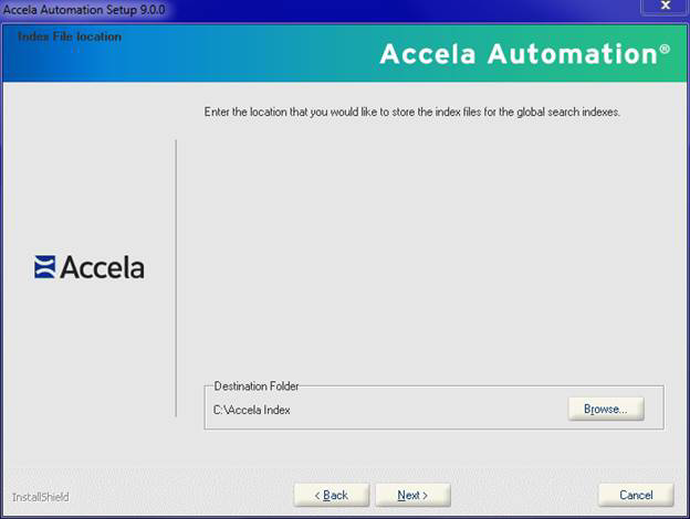 - Click Browse and change the folder name from Index to Accela Index, then click OK.