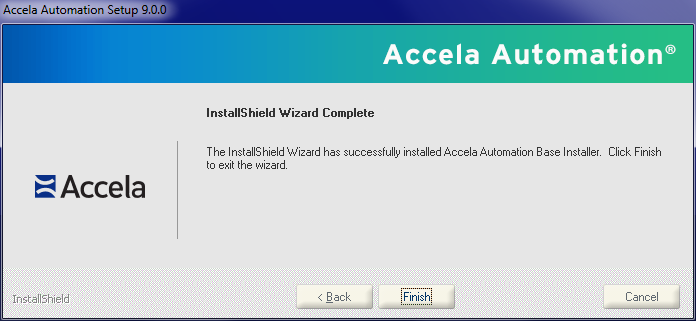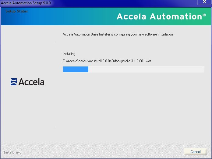 This Setup Status screen shows the progress of Accela Products installation. After the progress bar completes, setup performs actions based on the software components selected to install. The installer either detects an error or completes successfully.