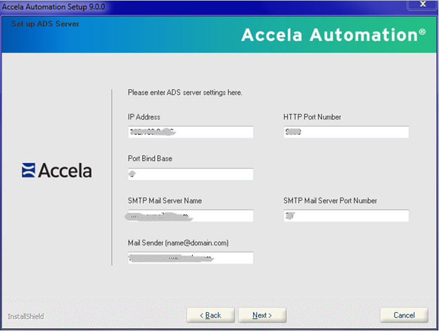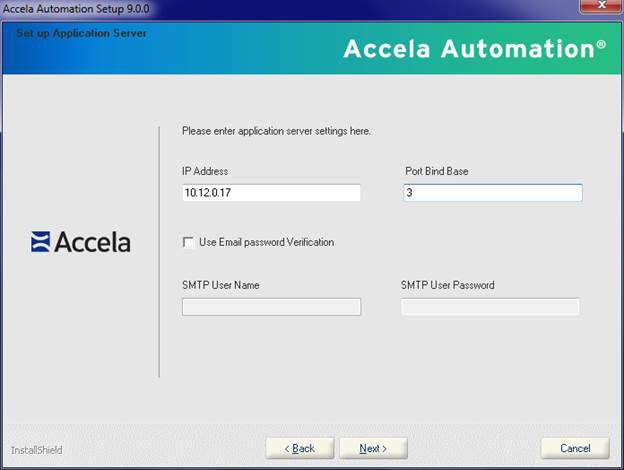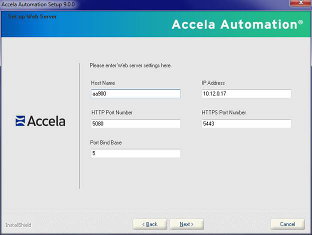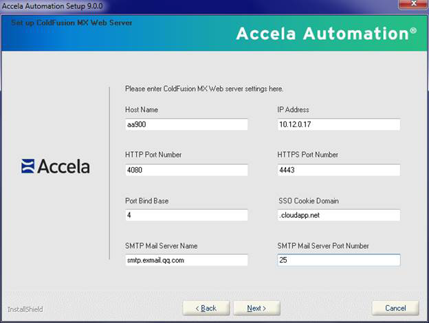 Note:- You must enter values in SSO Cookie Domain, SMTP Mail Server Name and SMTP Mail Server Port Number. The Port Bind Base field is the base number for all other ports except HTTP and HTTPS ports. The value must typically be a single-digit or double-digit between 1~65 (such as 2, 3, etc.), and becomes the “thousands” prefix for all other pre-defined values. The Port Bind Base concept applies to the setup of other Accela products. Each Accela product if installed on the same server should have a unique base.