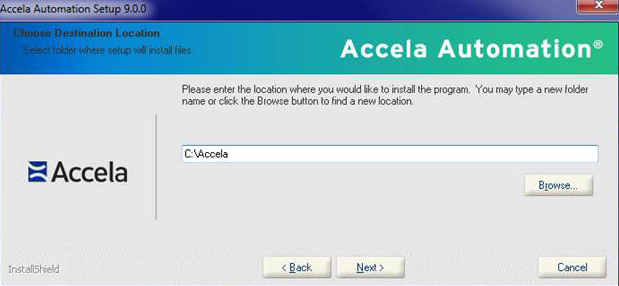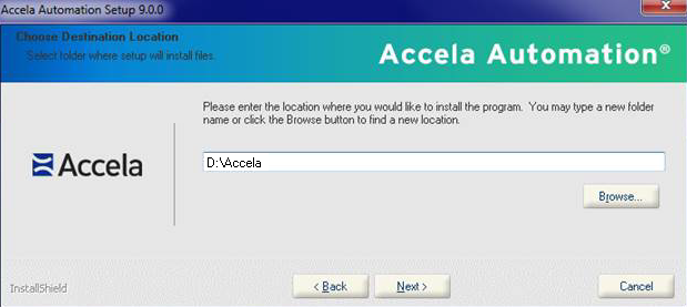 Click Browse to select a different location, such as the D:\ drive (the default destination folder is C:\Accela).