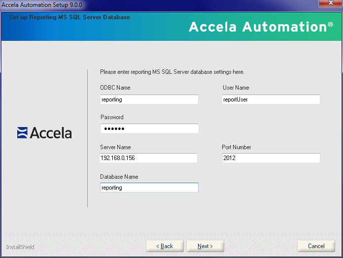 Figure: The Set up Reporting MS SQL Server Database screen