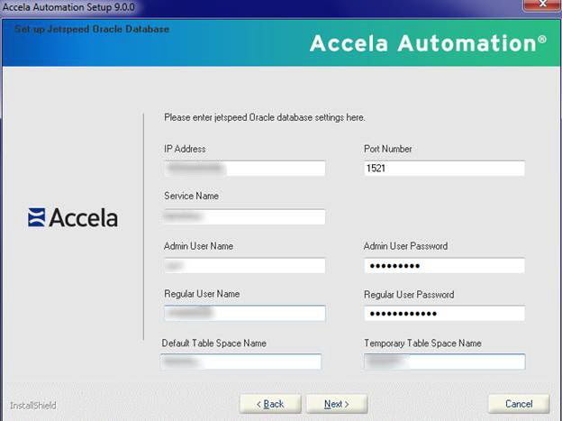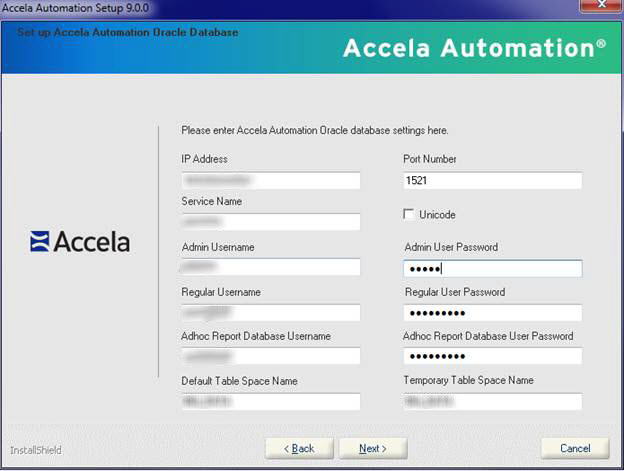 Note: For the Regular User Password and Adhoc Report Database User Password fields, do not include special characters such as !, #, -, _, etc. If your agency has a security policy that requires passwords to have special characters, passwords can be changed after the Civic Platform installer has created the database users. - Enter parameter values for the Oracle database server or the SQL Server database