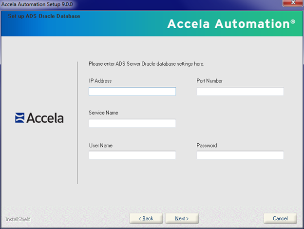 The Set up ADS Server Oracle Database screen displays.