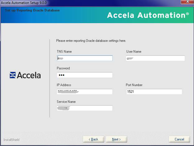 - Enter configuration parameter values for the Oracle database server or the SQL Server database server.
